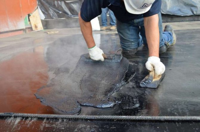 | Нанесете мастика на основата на битум върху дървения под, стените на височина 20-25 сантиметра.За да изпълните работата, използвайте валяк или четка (специална четка). След 4-6 часа след нанасяне на първия слой, нанесете втория. В този случай ролката трябва да бъде преместена в обратна посока. В процеса на сушене на разтвора е необходимо да се изключи навлизането на прах и мръсотия върху него. |