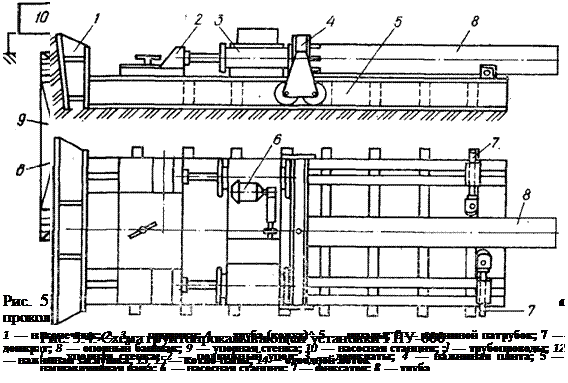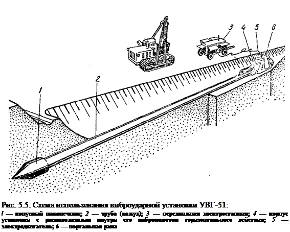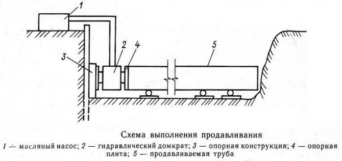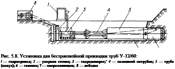 Полагането на тръби с диаметър 1220 mm за дължина до 60 m в сухи и влажни почви от групи I-III се извършва с помощта на инсталацията U-12/60. Инсталацията съдържа глава с совалка, монтирана в долния отвор на тръбата, хидравлично криково задвижване, което развива сила на притискане до 3400 kN, помпена станция, лебедка и тяга (фиг. 5.8).