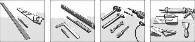 | Режещ трион, стоманена владетел, нож | B Транспортир, нивелир, метър, молив | B Нормален и гумен чук, електрическа бормашина, гаечен ключ, отвертка | D Спринцовка за уплътнител, мистрия, шпатула |