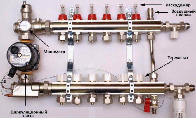 - Вентилите са затворени до разпределителя и е организирана циркулацията на зоната "котел - колектор". Отоплителният котел е свързан, но не с максимална мощност, и циркулационната помпа. Точките на закопчалката се проверяват.