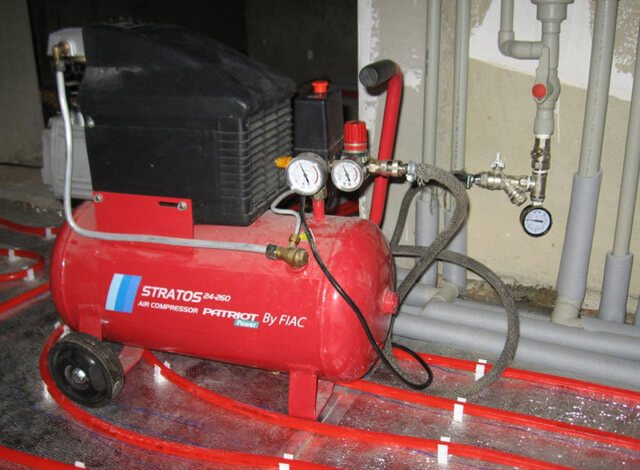 - Изпитване на сухо налягане. Въздухът се изпомпва в тръбопровода при налягане 2-3 пъти по-високо от нормалното. Работата се извършва преди изливането на замазката с проектната температура на водата.