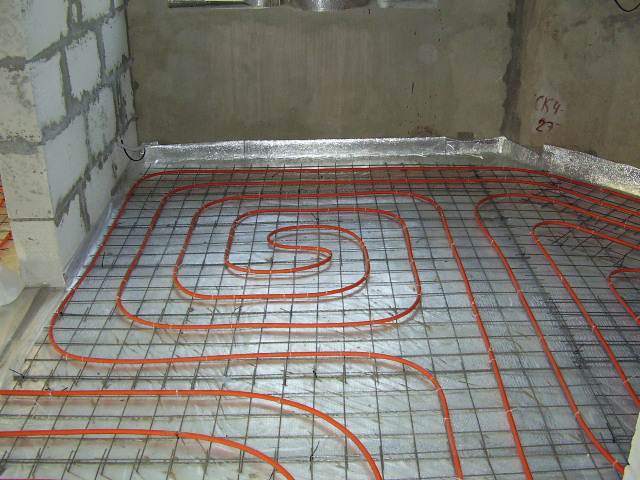 На снимката - отоплителни вериги, положени върху армираща мрежа