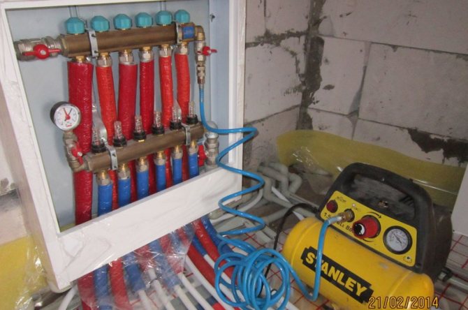 Ако не е възможно да се напълни вода, подовото отопление може да бъде под налягане с въздух.