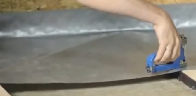 Валцуваната пароизолация е фиксирана по целия периметър на повърхността, за да бъде покрита със строителна телбод и лепяща лента. В случай, че по-нататъшната работа не предвижда изолация, за монтажа на изолационния материал можете да използвате дървени или пластмасови летви, завинтени към повърхността с самонарезни винтове.