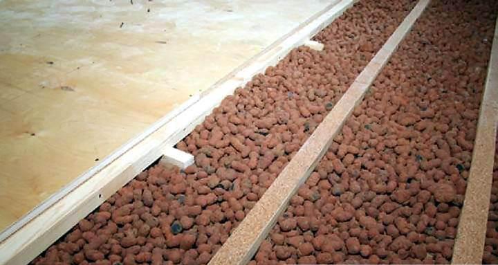 Ако се използват хлабави топлоизолационни материали - експандирана глина, първо трябва да подготвите състава. За да направите това, смесете компоненти от различни фракции (от 10 до 20 мм) и след това равномерно запълнете пространството между изоставанията.