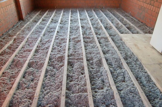 - След това пространството между изоставащите се запълва с топлоизолационен материал възможно най-плътно. В този случай е необходимо също така да се осигури малка междина, така че подовите настилки да не лежат директно върху изолацията.