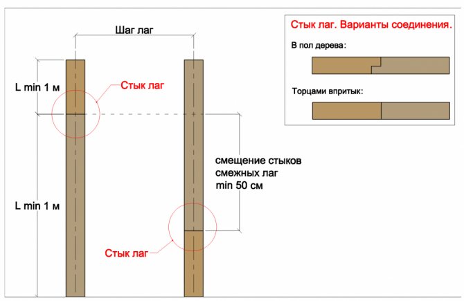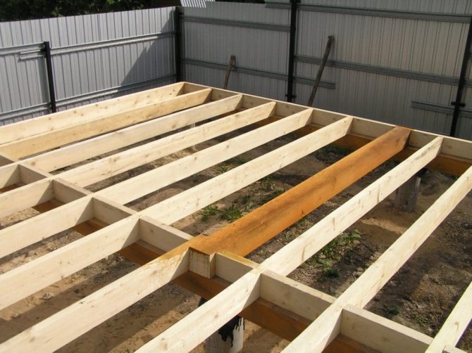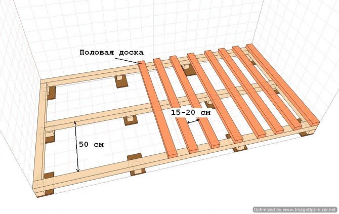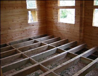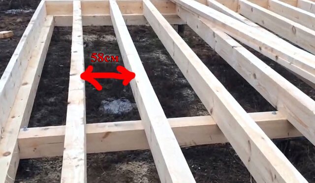 Върху хидроизолационния слой се полагат дървени греди. Разстоянието между съседните изоставащи греди (стъпало на закъснение) се определя от тяхното сечение, както и от носещата способност и твърдостта на покриващите подови слоеве - решетка, под, покритие Обикновено се предприема стъпка, която е удобна за полагане между трупите на стандартни плочи от изолация от минерална вата, около 600 мм.