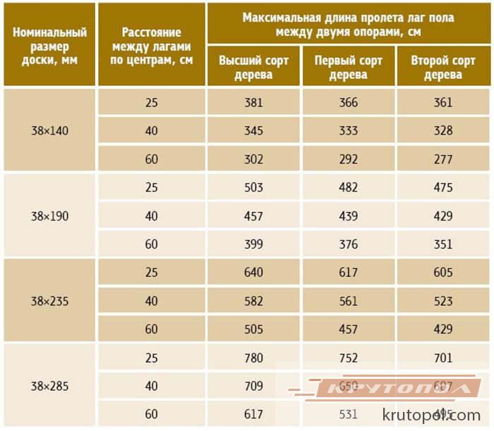 Таблица на разстоянието между подовите греди под дъската:
