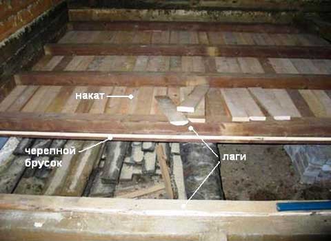 - След това отдолу върху трупите по цялата дължина се пълнят черепните пръти, върху които от своя страна се полага основата. За неговото инсталиране можете да използвате необрязна дъска. Полагането трябва да се извършва възможно най-плътно и е по-добре да се запълнят останалите пукнатини с полиуретанова пяна.