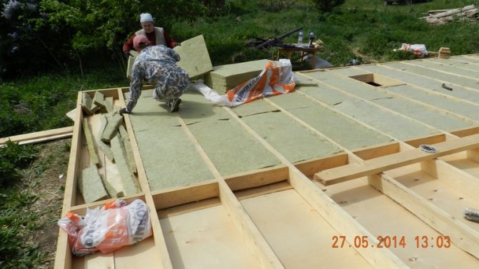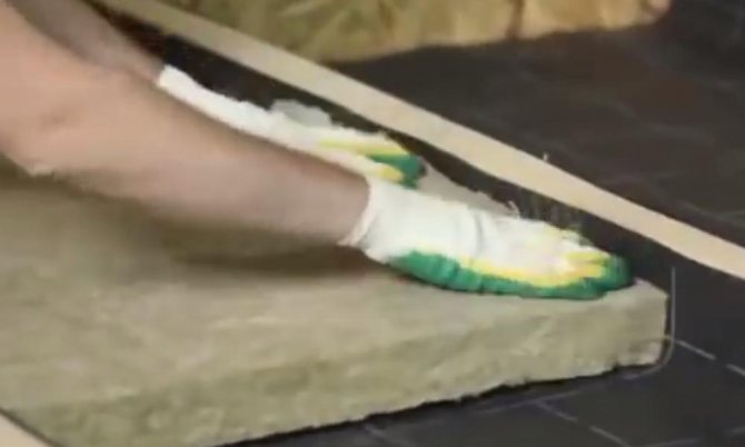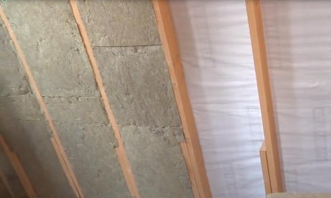 Изолацията от минерална вата се полага върху ветроустойчивия филм в оформения канал между трупите. Можете да направите без ветроустойчив филм, ако използвате специални изолационни плочи с уплътнен ветроустойчив слой за долния слой.