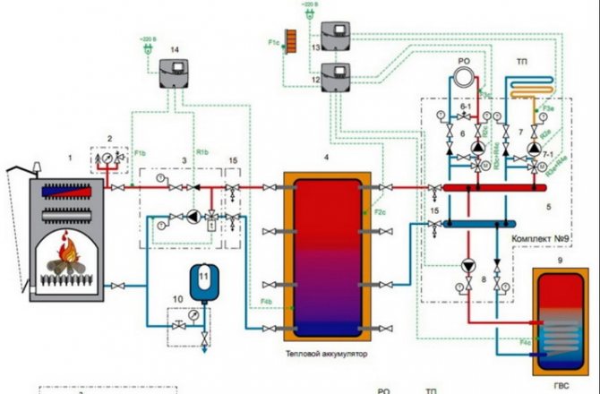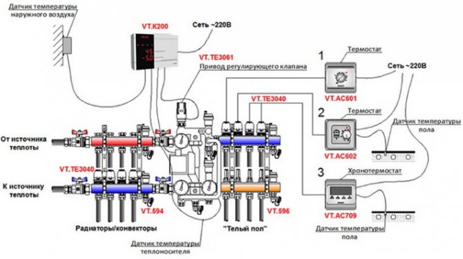 - модерна част е термостатът, който може да бъде програмиран. Съдържа няколко сензора за измерване на температурни индикатори. Тези сензори изпращат информация към управляващото устройство (контролер). Той е в състояние да поддържа едновременно различни температури в отделни помещения;