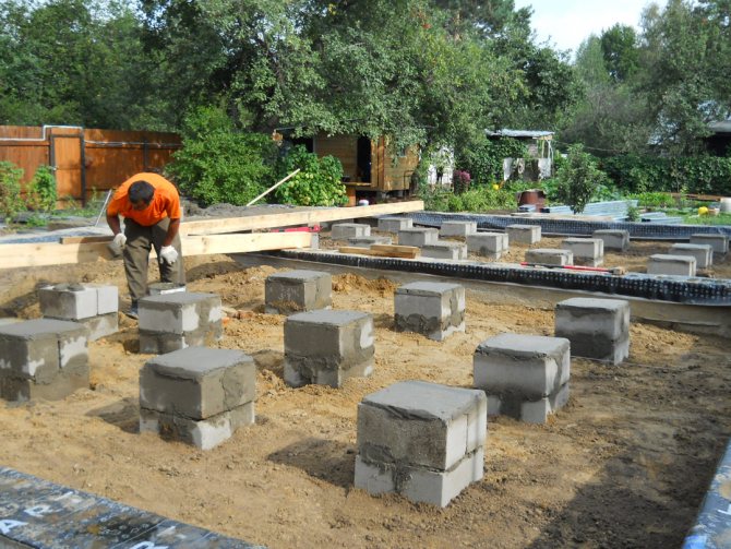- Извършете маркировка на местата на стълбовете за трупите (в случай, че трупите не са инсталирани при обвързването на основата). Височината на стълбовете зависи от това върху коя част от стената ще опират трупите. Това може да бъде дървен материал от първия ред или решетка (покрита с покривен материал, дървен материал за връзване на основата).