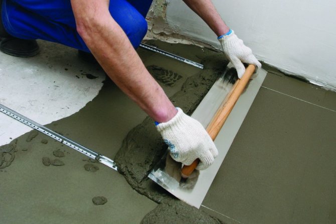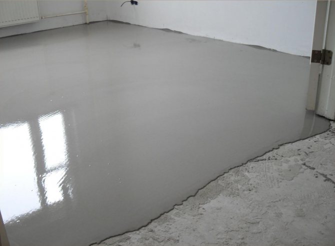 - Масата се излива върху пода със слой от 0,3-1 см и се изравнява с шпатула.