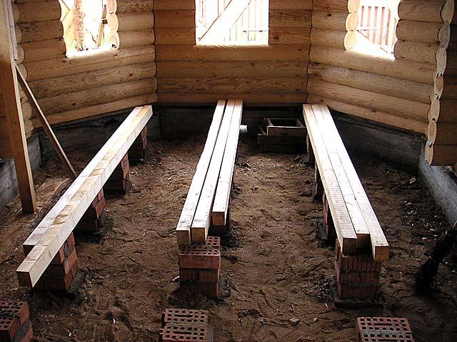 Като изоставане се използват дървени трупи, нарязани на две половини, барове с пропорция 1: 1,5, двойни дебели дъски от иглолистни дървета. Ако трупите не са били монтирани при обвързването на основата, те могат да бъдат поставени върху подготвена почва или върху тухлени стълбове върху бетонна основа.