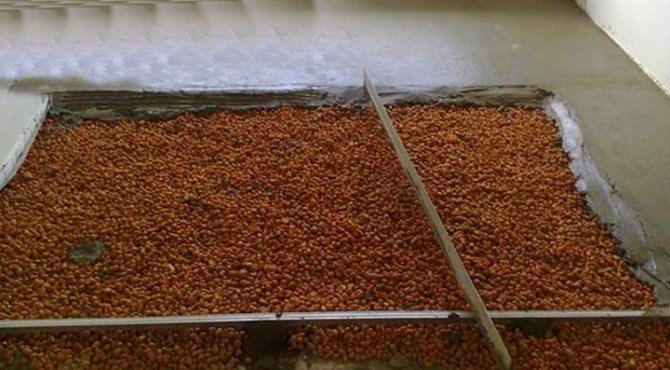 - Натрошен разширен глинен състав се изсипва между фаровете. Изравнете материала върху хидроизолационния слой.