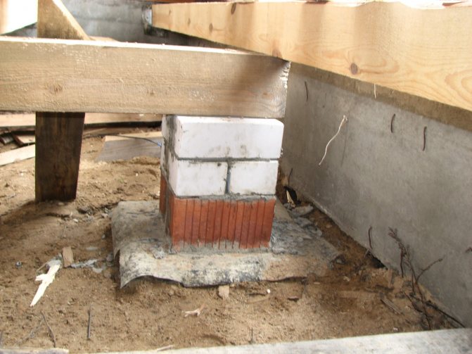 - Тухлените стълбове от 2 тухли са разположени строго вертикално (по отвес) върху покривен материал, така че последният слой тухли да е перпендикулярен на посоката на трупа. За да се получи разтвор, циментът M100 и пясъкът се смесват в обемно съотношение 1: 3 и водата се добавя на око.