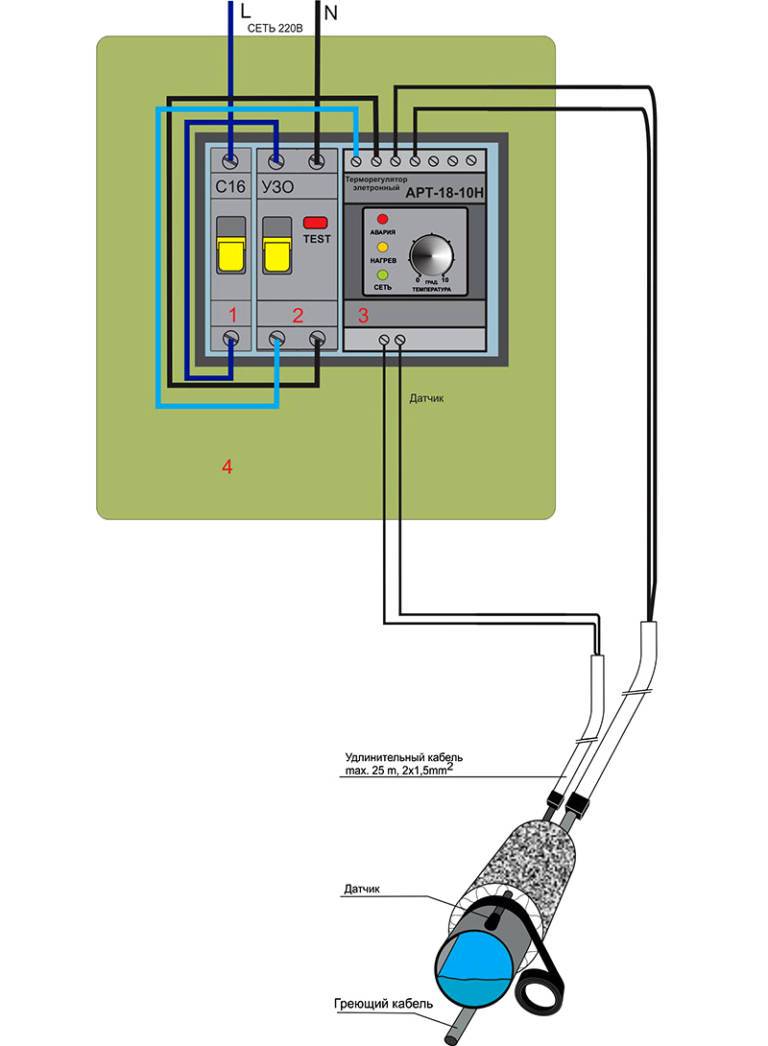Системата против заледяване трябва да има индивидуален щит, за който е подходяща електрическата мрежа 220 V. В щита са инсталирани автоматична машина със съответната мощност, превключвател за видим прекъсване на веригата, RCD.