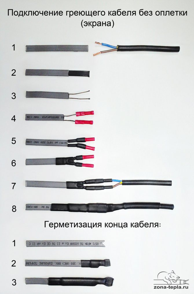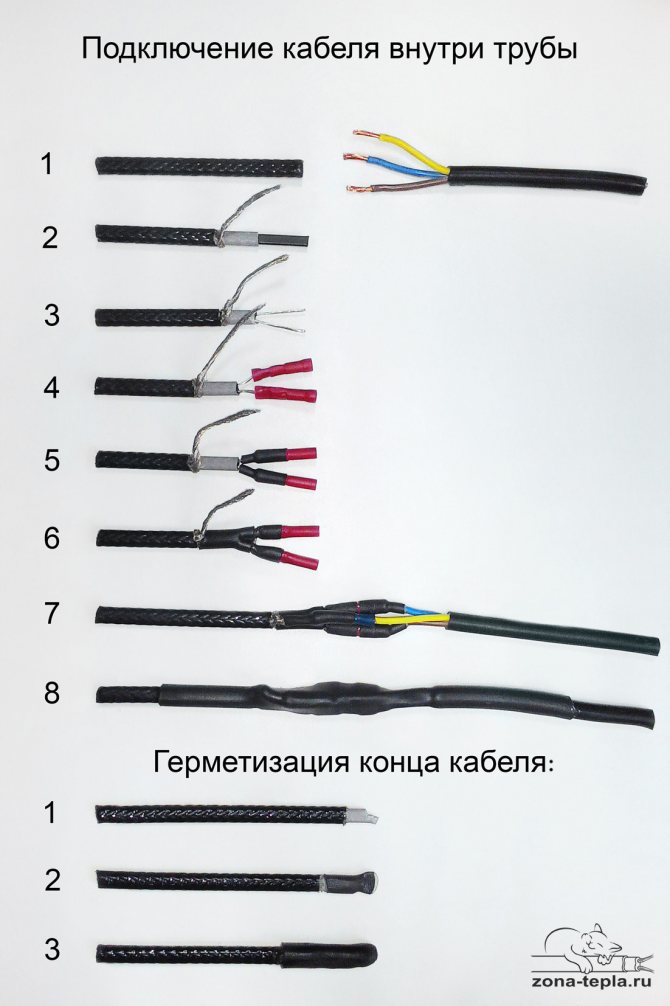 По-долу, на три снимки, са показани накратко етапите на свързване на саморегулиращ се нагревателен кабел без екран, с екран и нагревателен кабел вътре в тръбата с адхезивен комплект съединители (последният се отличава с крайна капачка). Подробни статии на съответните връзки.