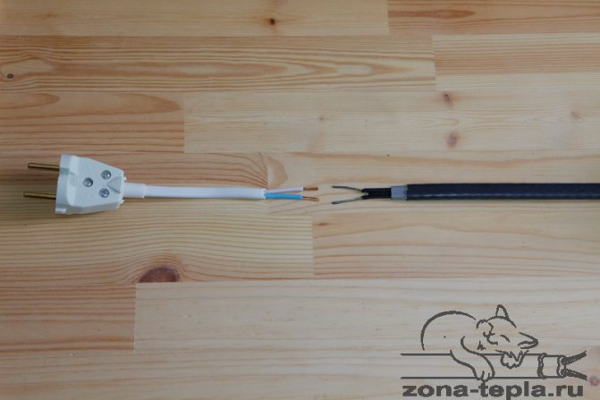 Принципът на свързване на саморегулиращ се нагревателен кабел е много прост. Достатъчно е просто да свържете проводящите ядра към мрежата 220. И е задължително да изолирате втория край на нагревателния кабел, така че да няма контакт между проводящите ядра. Плитка за заземяване, ако има такава.
