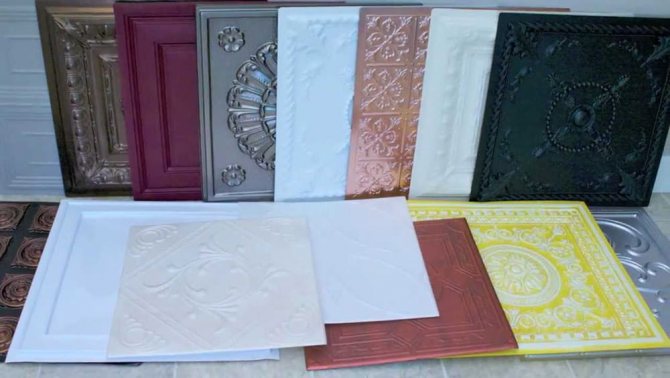 Таванните плочки от стиропор имат различни цветове и шарки. Може би ще намерите подходящ модел както за традиционен, така и за модерен интериор. Що се отнася до размерите, в допълнение към това, в основата на фигурните плочки има две основни форми: правоъгълник и квадрат, в зависимост от това могат да бъдат намерени елементи със следните размери: