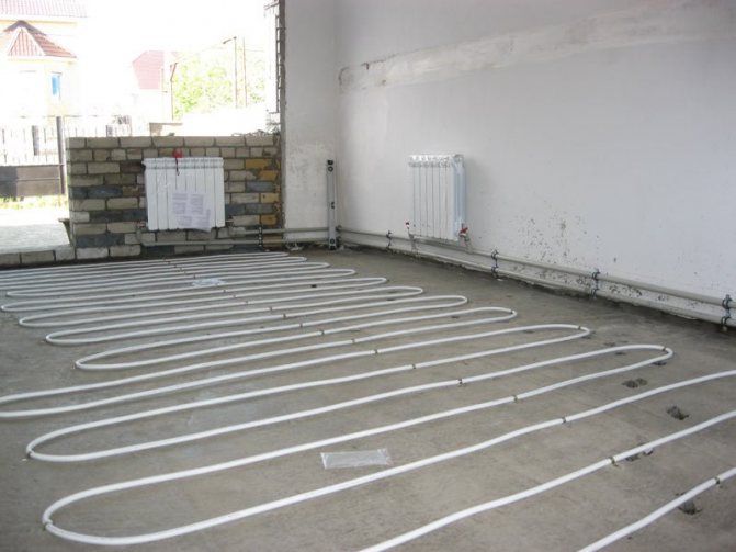 Тръбите се поставят успоредно и се монтират от стените към центъра. В средата на помещението захранващата линия завършва с контур, който се превръща в обратна верига, която, напротив, преминава от центъра към колектора.
