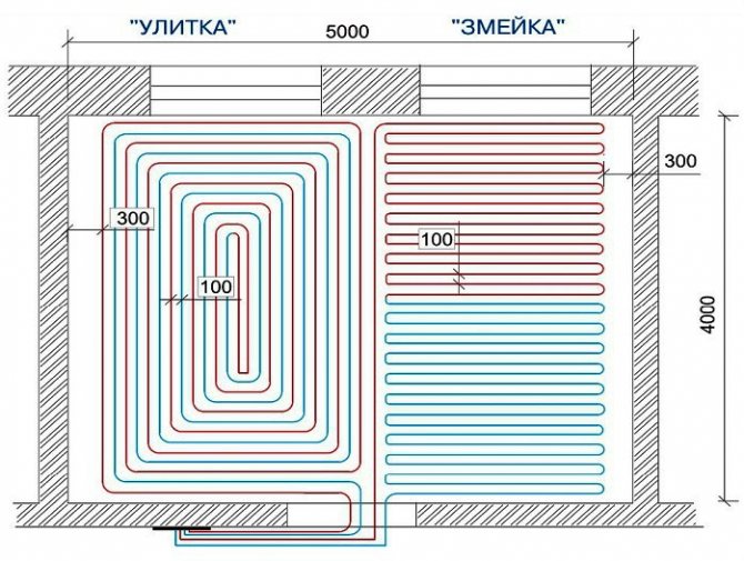 Необходимо е да се вземе решение за. Има 2 основни опции - змия и охлюв (спирала). Освен това на милиметрова хартия, като се вземе предвид размерът на помещението в мащаб, се изготвя диаграма на оформлението на контурите. Изчисленията най-вероятно ще трябва да се извършат няколко пъти. Следователно, при изчисляването на тръби за топъл под, онлайн калкулатор ще може да предостави безценна помощ.