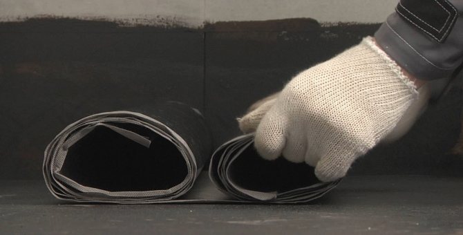 След това се измерва необходимата дължина на хидроизолационната ролка, като се вземе предвид крайното припокриване (най-малко 150 mm). Полученият разрез на материала се навива на руло от двете страни, след което защитното фолио се изрязва внимателно и материалът се полага върху повърхността при отстраняване на филма. Възможните вълни и мехурчета се разточват с твърда четка или валяк.