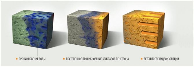 Процесът на хидроизолация се извършва с помощта на специални съединения, състоящи се от портландцимент, финозърнести пясък и полимерно-химични компоненти. Активните вещества на сместа, попадайки в порите и увреждащи бетона, образуват неразтворими кристали, които напълно запълват кухините.