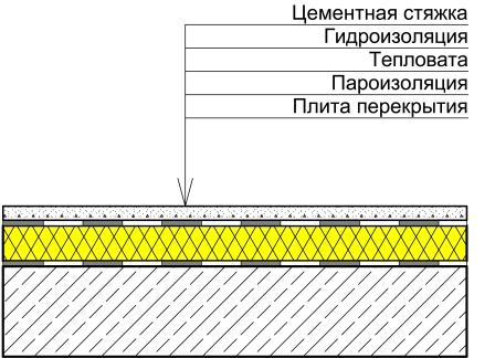 За полагане на изолацията върху плочите е прикрепена дървена греда. Между дървените трупи се поставя изолация под формата на насипен материал или горни топлоизолационни плочи от различен тип. Разхлабената изолация се излива на слой от 20 - 30 см върху залепения върху плочите покривен материал и се изсипва с не дебел слой хоросан.