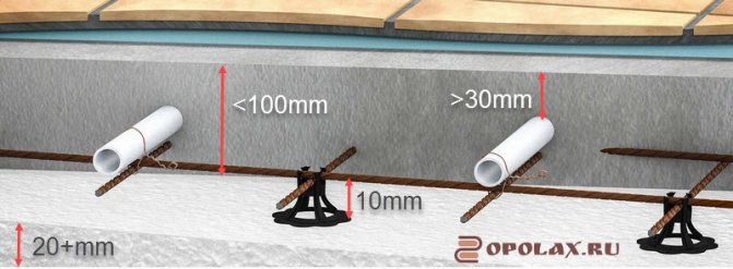 Когато се монтира топъл под на бетонна основа, със слой изолация не повече от 20 мм, дебелината на замазката над тръбите трябва да бъде: