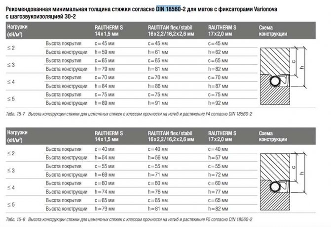 Минималната дебелина на замазката трябва да надвишава 6,5 см, препоръчва се за плочки, които не се страхуват от прегряване. Оптималното пълнене на тръбите е 10 cm.Този параметър е предвиден за системи за подово отопление в жилищни помещения. За индустриални сгради или складове максималната дебелина на бетона може да бъде до 20 cm.
