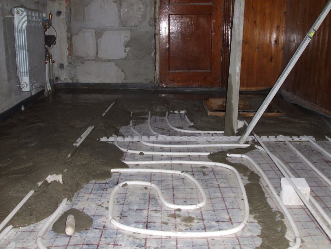Преди да излеете груба замазка на водно топъл под, е необходимо да инсталирате захранващи кабели и други инженерни линии. Стените и таванът са изравнени с гипсов хоросан. Ако извършвате работата в обратен ред, ще трябва да изчакате, докато замазката се втвърди. След това ще е необходимо да го почистите от нови замърсители.