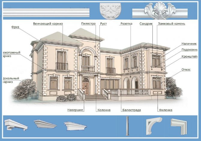 Формоването с пяна може да се използва за самостоятелно сглобяване. Много архитектурни елементи ще ви помогнат да направите дома си красив: прозорци, первази, фронтони, корниз, пиластри, балюстради. Всеки елемент от фасадата е обработен със специално покритие, така че можем уверено да говорим за устойчивостта на материала на външни влияния. Малките декоративни елементи могат да променят екстериора на сградата до неузнаваемост.