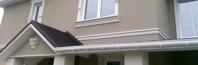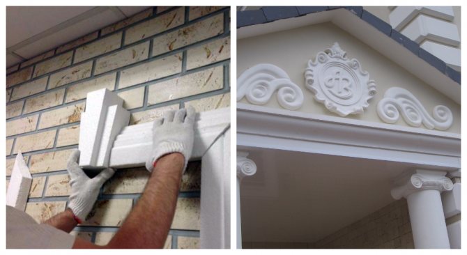 Съвременните дизайнери използват по-леки материали за фасади. Фасаден декор от експандиран полистирол се характеризира с лекота на монтаж и издръжливост. За разлика от дървените и гипсовите конструкции, материалът не се страхува от влага. В сравнение с каменните изделия, пяната е лека. Избирайки желания нюанс в широка гама от цветове, можете благоприятно да определите основния цвят на сградата или да изберете контрастен завършек.