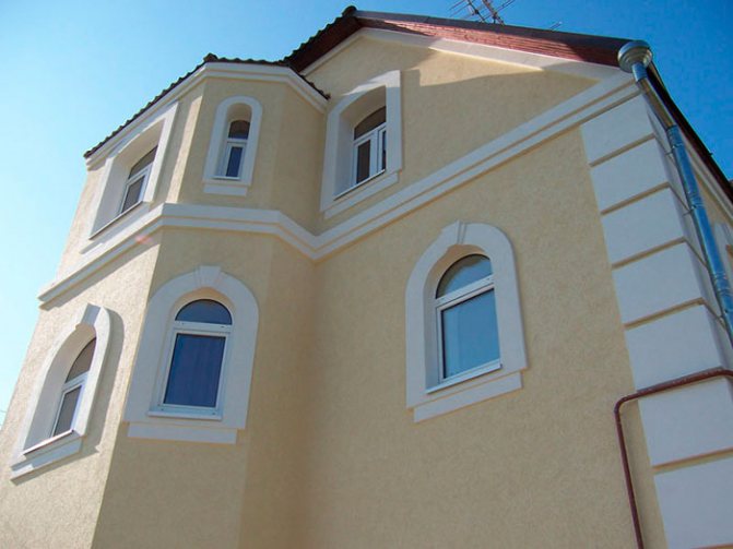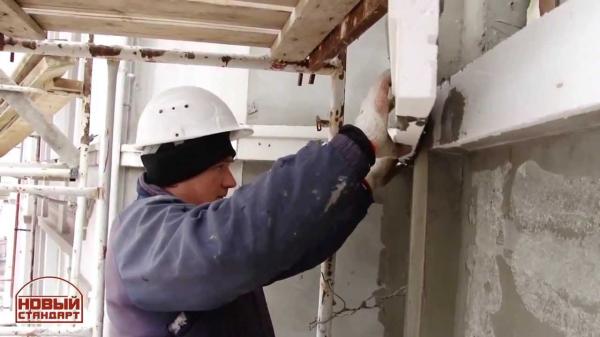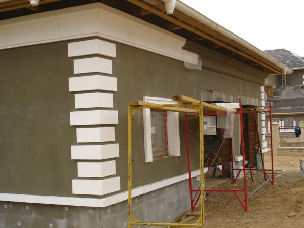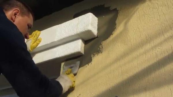 - Подравняване на фасадната конструкция, върху която се планира да бъде монтиран декорът.Като правило такива зони включват корнизи, первази на прозорци, определени зони на стената, отвесни прозорци и отвори на вратите. Изравняването се извършва чрез нанасяне на мазилка.
