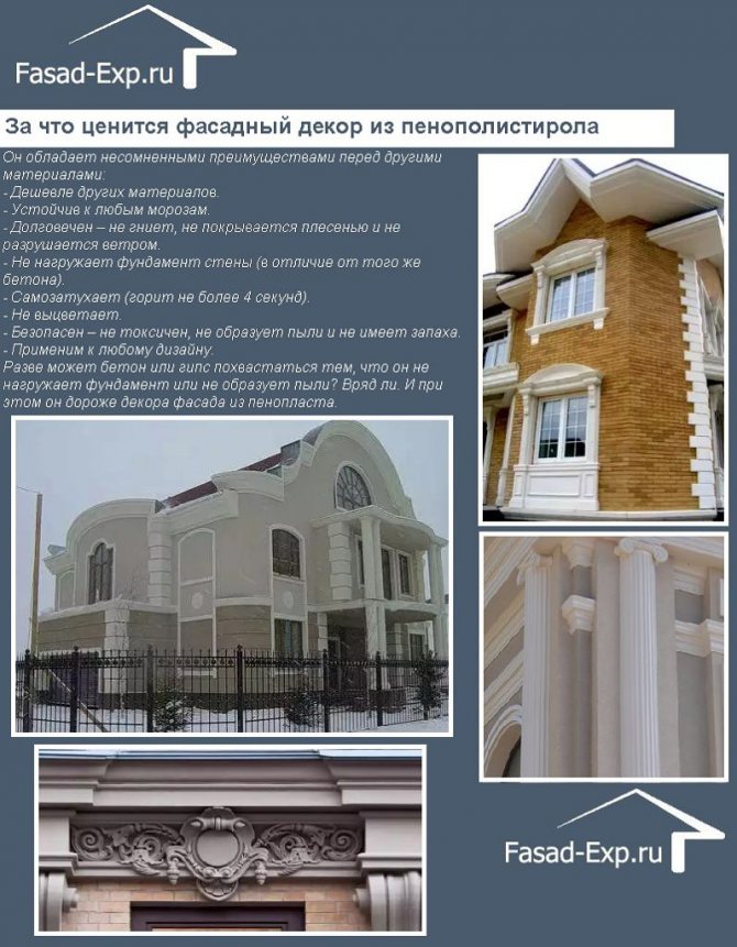 Елементите за фасадата от експандиран полистирол постепенно заменят декорациите от гипс и бетон, които са обемисти и тежки. В крайна сметка наличието на последния върху конструкцията значително увеличава натоварването върху основата и носещите стени, което изисква тяхното допълнително укрепване.