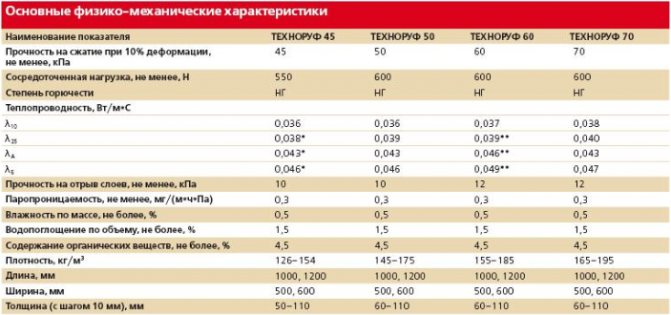 | Остаряло име | Плътност | Дебелина, мм | Топлопроводимост A25 | Пропускливост на водна пара, не по-малко от mg / (m h Pa) | Съдържание на органични вещества, не повече,% | Якост на натиск при 10% деформация, не по-малко | |