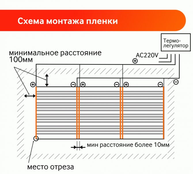 Филм топъл под работи от стандартна мрежа 220 V, 50 Hz... Свързване на ленти към мрежата - паралелно... Схематична схема на свързване на филмов топъл под (отново, фокусирайки се върху нашия пример) е представена по-долу.