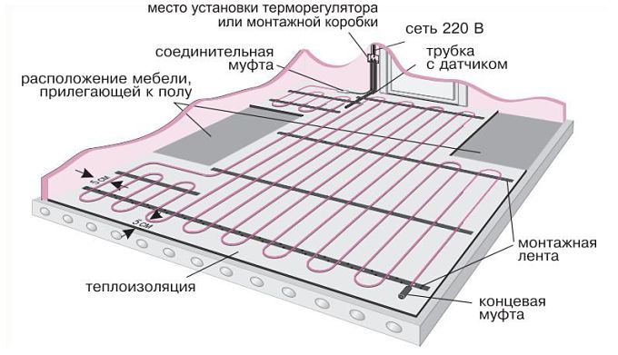 Като правило конвенционалните кабелни системи не трябва да се монтират под мебели, в противен случай кабелът може да прегрее и да се влоши. Саморегулиращи се кабели могат да се монтират под целия под.