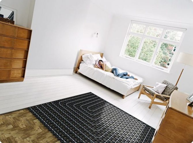 Основното предимство на такива подове е възможността да ходите боси, без да се страхувате от настинка. Това е особено важно за спалнята, тъй като ставането от леглото е много по-приятно да се докосне до затоплената повърхност. Използването на подово отопление увеличава ефективността на отоплението и намалява разходите за отопление през студения сезон с почти 30%. И също така да се изключи образуването на мухъл, защото ъглите на стаята винаги ще са сухи.