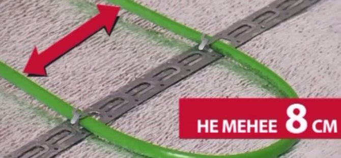 Когато се изолира под с нагревателен елемент под формата на кабел, върху изолацията се полага специална монтажна лента за фиксиране на намотките на кабела. Препоръчителното разстояние между ленти от лента е 0,5 метра. Лентата е закрепена с дюбели към грубата замазка. Ако подложките се използват като нагревател, тогава монтажната лента не е необходима, така че можете веднага да започнете инсталационната работа.