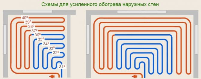 На стените и портите тръбните контури се полагат с по-малка стъпка. По-близо до средата се увеличава. Захранващият тръбопровод е положен по-близо до външните стени.