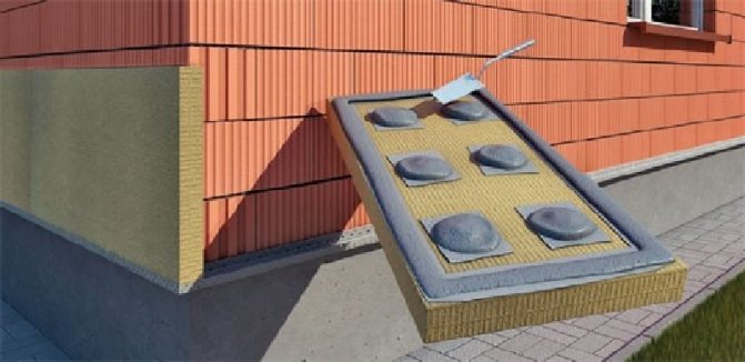 Топлоизолацията се монтира върху подготвената повърхност на стената с помощта на специално лепило. Дебелината на минералната вата или пяна трябва да бъде най-малко 50 мм.