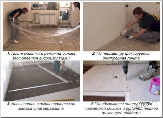Преди да се пристъпи към събирането на суха замазка от листове GVL, върху дървена или стоманобетонна основа се полага слой хидроизолационен материал. За тази цел най-често се използва експандирана глина, тъй като тя изравнява и изолира добре пода.Въпреки това, първият слой, който поставяте директно върху повърхността на подовете, трябва да бъде полиетилен с дебелина 200 микрона или повече. На някои етажи можете да поставите пергамент или покривна хартия. Този първи слой ще поеме функцията за бариера срещу пара.