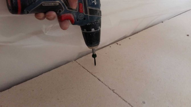 - Полагаме първия слой гипсокартон за пода, монтирайки листовете от ъгъла, който е най-близо до входната врата към стаята. Фиксираме плочите към решетката с помощта на самонарезни винтове с необходимата дължина.