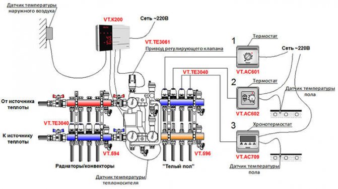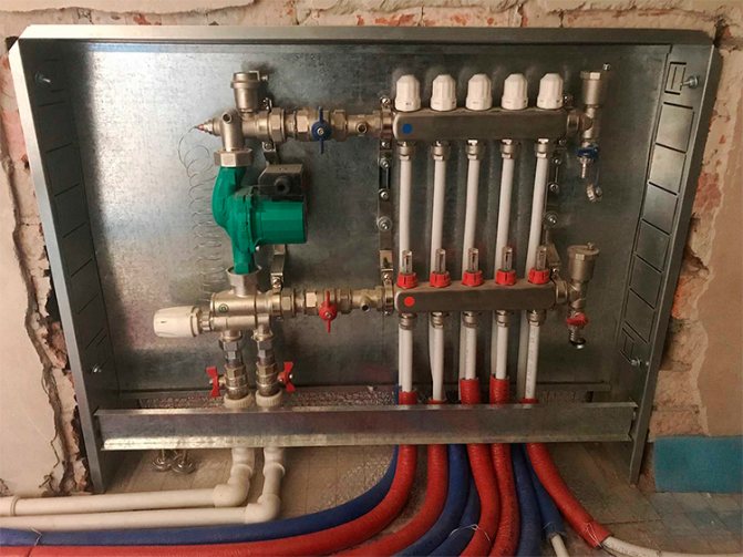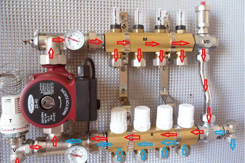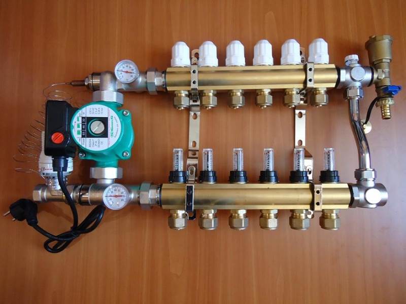 Шкафът на колектора е снабден с блок, отговорен за регулиране на водния поток, който влиза в пода на пода и се връща обратно.