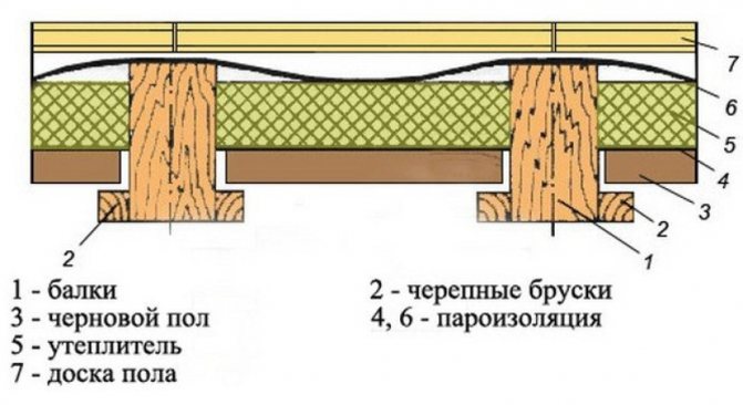 Схемата на изолирания дървен под, гледана отстрани на оборудваните помещения, трябва да изглежда така: