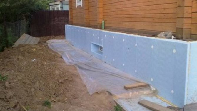 - Извършете хидроизолационни работи, които надеждно ще защитят подземното пространство от влага: фиксирайте плочите от пяна към основата отвън. И тогава основата на къщата ще стане не само топла, но и устойчива на влага.
