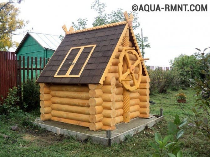 Можете сами да направите такава дървена къща или да си купите готова версия. Във всеки случай си струва да се знае, че къщата не е просто инсталирана на повърхността на земята. Той се нуждае от фундамент, който се извършва по следния начин: зоната около кладенеца се изравнява и се прави сляпа зона, върху която се изсипва слой фин чакъл или се полагат плочки.