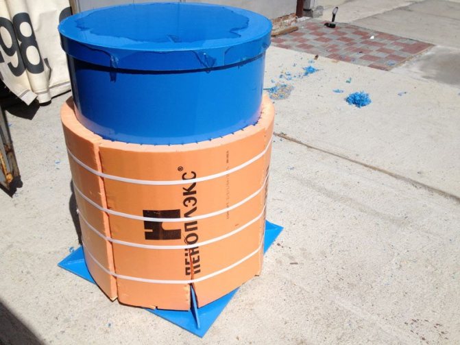 - Залепете пеноплекс върху бетонни пръстени. Трябва да се нарязва на парчета с ширина 100 mm. Трябва да има 2 слоя, следващият отива с припокриването на шевовете на първия.
